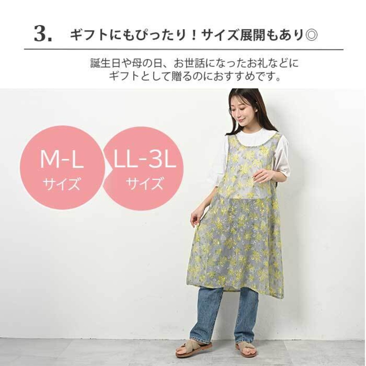 ゆったり着られるM-LサイズとLL-3Lサイズの2サイズ展開。